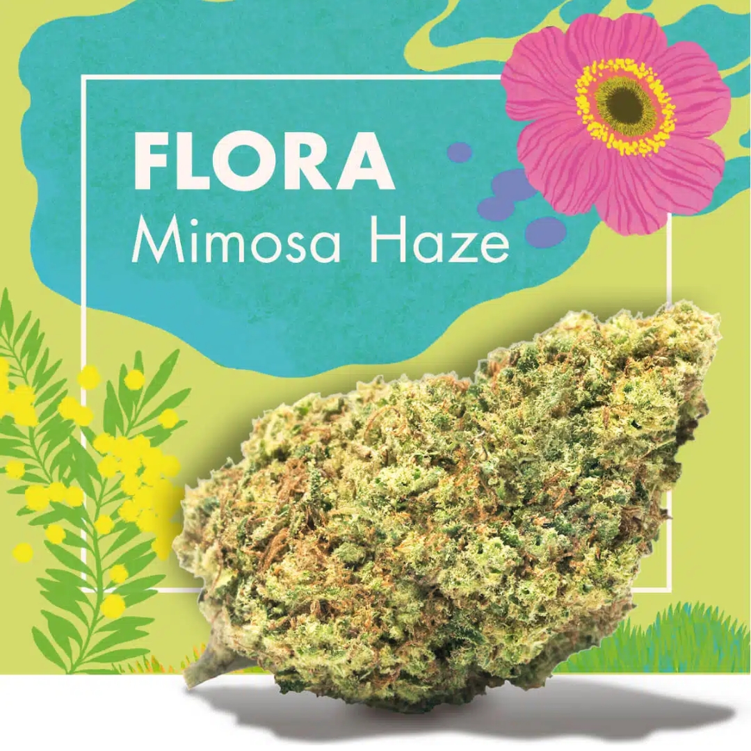 🍊 FLORA (Mimosa Haze) – Aroma cítrico e doce, com notas de laranja, flores frescas e um fundo de Haze. Cultivada organicamente Indoor, muito resinosa e com até 26% de CBD.